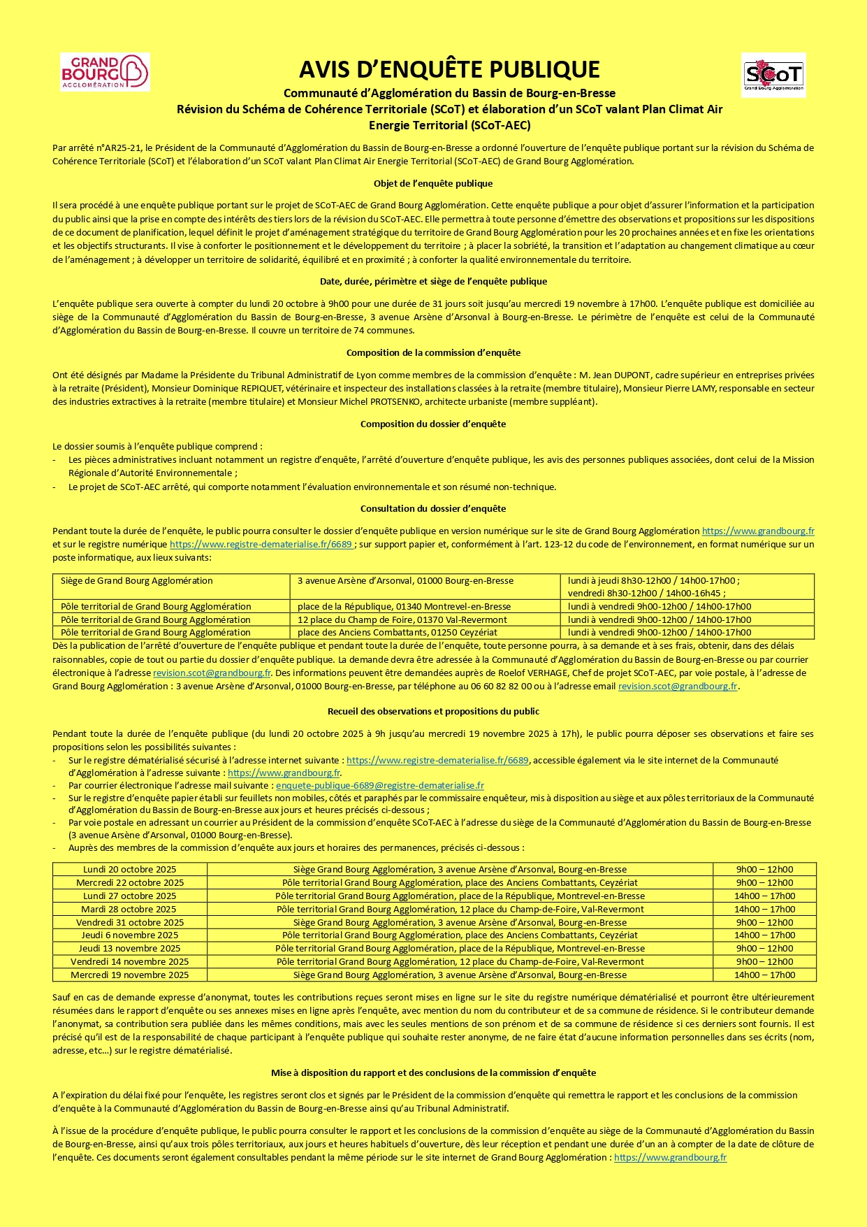 L’enquête publique sera ouverte à compter du lundi 20 octobre à 9h00 jusqu’au mercredi 19 novembre à 17h00