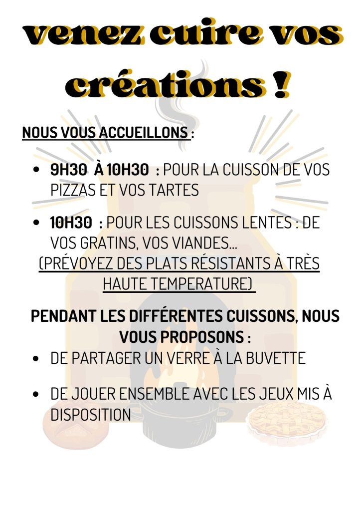 🔸 9h30 à 10h30 : pour la cuisson des vos pizzas et tartes 🥧